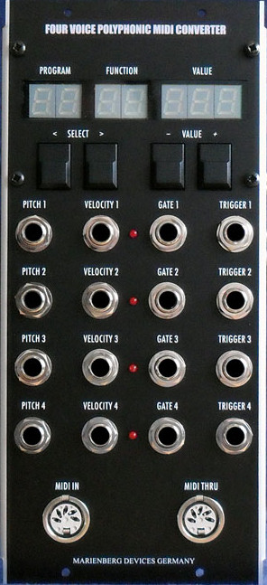 Analoge Tastaturen oder auch Steuereinheiten (z. B. Sequenzer) mit Ausgängen für Steuerspannungen (CV) und Triggersignale (Gate) sind in der heutigen Zeit nicht mehr in Mode. Alles ist midifiziert! Deshalb benötigt man ein Modul um die digitalen MIDI-Signale (Musical Instrument Digital Interface) von z. B. einem Masterkeyboard in analoge Steuerspannungen und Triggersignale umzusetzen. Der Four Voice Polyphonic MIDI Converter stellt zwei unterschiedliche Modi für die Umsetzung dieser Signale zur Verfügung: Four Voice Polyphonic Mode Die ankommenden Signale (MIDI IN) werden zyklisch auf die vier vorhandenen Kanäle verteilt. Dabei legt ein Untermodi den Zyklus der Verteilung fest: