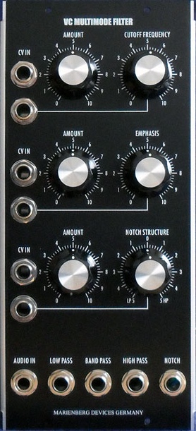 Ein Filter ist in der Lage, durch Abschwächen bzw. Unterdrücken bestimmter Frequenzbereiche das Obertonspektrum eines Grundtons so zu verändern, dass eine neue Klangfarbe (Timbre) entsteht. Nachdem mehrere Filter mit unterschiedlichen Flankensteilheiten entwickelt wurden, kamen wir schnell zu der Erkenntnis, daß für unsere Ohren eine 12 dB Flankensteilheit das homogenste und musikalischste Klangbild erzeugt. Am Ausgang des VC Multimode Filter A liegen gleichzeitig ein Tiefpass (LOW-PASS), ein Bandpass, ein Hochpass (HIGH-PASS) und ein Notch an. Der Filter kann durch seine hohe Linearität und seinen temperaturstabilisierten Exponential-Konverter als spannungssteuerbarer Sinus-Oszillator (+/-5 V) eingesetzt werden, wobei die erzeugte Sinus-Wellenform pegelstabil und oktavrein gleichzeitig an allen vier Ausgängen anliegt (20 Hz bis 20 kHz). Da die Schaltung zur Steuerung der Resonanz (Emphasis) über eine logarithmische Charakteristik verfügt, wird durch das Anlegen einer linearen Steuerspannung (CV) ein sehr differenziertes Steuern der Resonanzintensität über den gesamten Regelbereich erreicht. Dadurch genügen schon geringe Veränderungen der Steuerspannung, um hörbare Veränderungen im Bereich der Resonanz zu erzielen. Der Parameter Notch Structure wird verwendet, um die Betriebsarten Low Pass und High Pass stufenlos mittels Steuerspannung (CV) zu überblenden. In der Mittelstellung des Reglers (intern +5 V, ohne externe Modulation), welches die Notch-Struktur steuert, vereinigen sich beide Betriebsarten zum Kerbfilter (Notch), dessen Mittenfrequenz über die Cutoff Frequency steuerbar ist.. Technische Daten