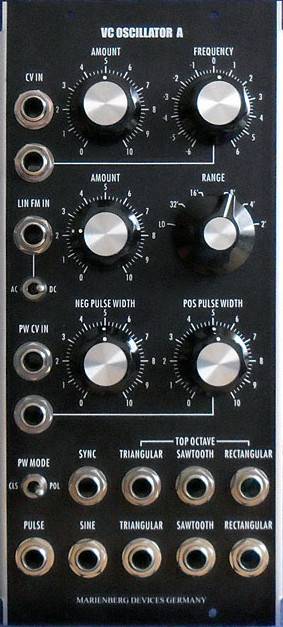 Am Anfang der Signalkette steht ein klangerzeugendes Modul, das Her(t)z des Synthesizers: Der Oszillator. Mit seinen periodischen Wellenformen ist er für die Erzeugung des Audiosignals zuständig. Nahezu 5 Jahre vergingen von der Idee bis zur Realisierung eines Oszillators, welcher die hohen Anforderungen erfüllte, die wir uns gestellt hatten. Durch den Einsatz eines speziellen Schwingkreises und der daraus resultierenden, parallelen Erzeugung aller Wellenformen, ist die Präzision der Linearität und der Schwingungsformen des VC Oscillators A weitaus höher als die herkömmlicher Oszillatoren. Ein Stromspiegel zur Erzeugung von Dreieck-Schwingungen ist überflüssig und außerdem entfällt durch seine hohe Linearität der High-End-Trim für die Fehlerkorrektur. Wir erreichen eine sehr präzise, lineare Frequenz-Modulation (FM). Näheres zur Entwicklung unseres VCO’s findet man auf den Seiten VCO und lineare FM und Probleme bei Rampen-Integratoren. Neben den fünf Wellenformen Sinus (SINE), Dreieck (TRIANGLE), Sägezahn (SAWTOOTH), Rechteck (RECTANGULAR) und Puls (PULSE) erzeugt der Oszillator simultan eine Top-Oktave für die Wellenformen Dreieck, Sägezahn und Rechteck. Diese liegen phasensynchron zur Grundoktave, bis zu einer Frequenz von 40 kHz, an separaten Ausgängen an. Die Pulsbreiten-Modulation (PWM) ist über zwei getrennte Steuerspannungen (CV), für die negative und die positive Halbwelle möglich und kann über zwei getrennte Regler eingestellt werden. Dadurch ist es möglich den stufenlosen Übergang von einem symmetrischen Rechteck zu einem variablen Puls, oder auch von einem Rechteck bzw. Puls zu einer Treppenspannung, welche sich dem Oberwellengehalt einer Dreieck-Schwingung nähert, zu realisieren. Bei der PWM kann zwischen “klassischer” und “polarisierter” Pulsbreite gewählt werden. Im klassischen Modus CLS ist die Summe der beiden Halbwellen immer 100%, z. B. 30:70 oder 45:55. Im polarisierenden Modus POL hat jede Halbwelle einen Anteil von 50% und liefert somit als Ergebnis einen treppenförmigen Wellenformverlauf. Da die Modulation der getrennten Pulsbreiten auch im Niederfrequenz-Bereich möglich ist, können bei der Frequenzmodulation (FM) eines zweiten Oszillator’s unterschiedliche Tonintervalle erzeugt werden. Mit dem Modul VC Oscillator A Suboctave Expansion kann der VCO um drei Sub-Oktaven für Sinus, Dreieck, Sägezahn und Rechteck erweitert werden. Technische Daten
